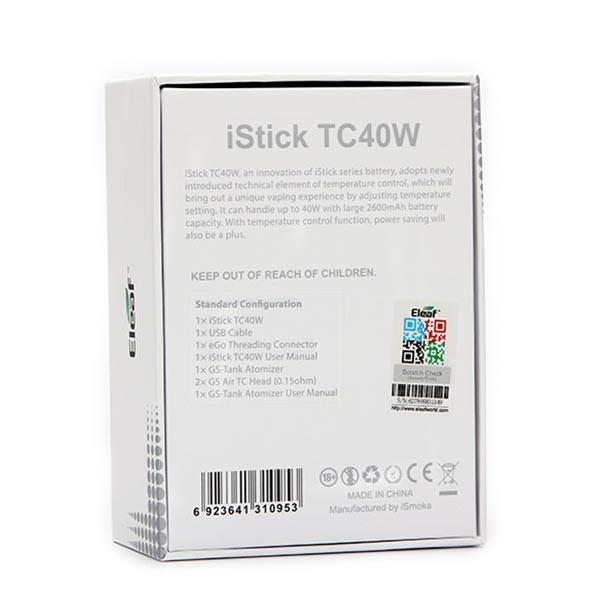 The TC 40W box features the familiar iStick design so many users love. A 2600mAh built-in battery powers the device, offering a full day's charge depending on your settings. A Micro USB port offers on-board charging. A spring-loaded 510 connection ensures compatibility with most third-party atomizers. The GS TC Tank hold 3.0mL of juice and features Nickel 200 heating coils.